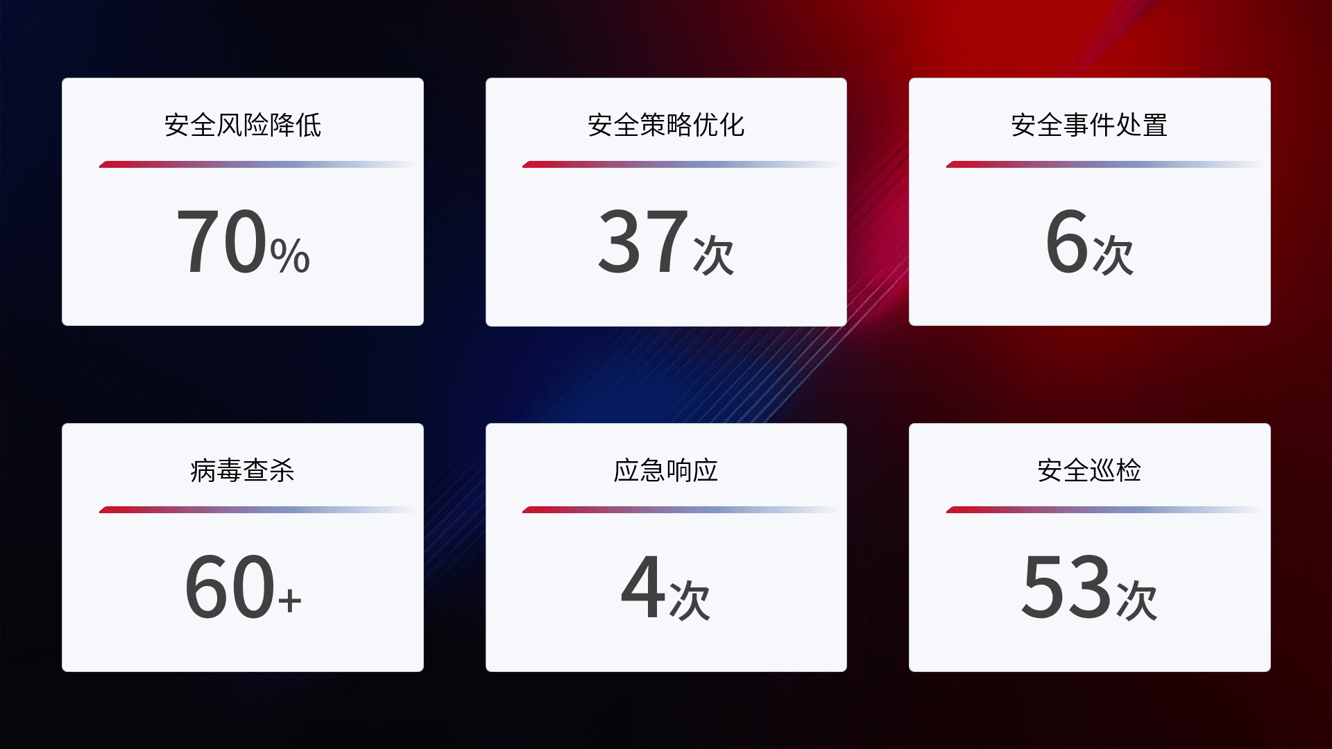 提供全面的安全事件报告体系,,,,包括处置报告、、、周报、、季度和年度总结,,,结合持续监控,,,,帮助客户深入了解网络安全状况。。。。